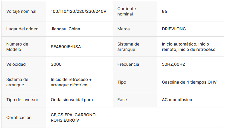Con una salida máxima de 4200W, la salida de funcionamiento de 3700W, SE4500iE de DRIVELONG es ideal para su RV, su viaje de campamento, un fin de semana de tailgating, proyectos al aire libre y como fuente de energía de respaldo durante una emergencia. En comparación con los generadores tradicionales del mercado, SE4500iE tiene ventajas obvias, excepto por su diseño duradero y compacto. Es un generador de inversor silencioso, se puede utilizar de muchas maneras, como generador de camping, conducción de turismo, etc.
